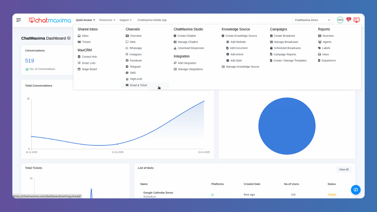Navigate to Email & Ticket Settings From the ChatMaxima Dashboard, go to Quick Access, then select Channels, and choose the Email & Ticket section.
